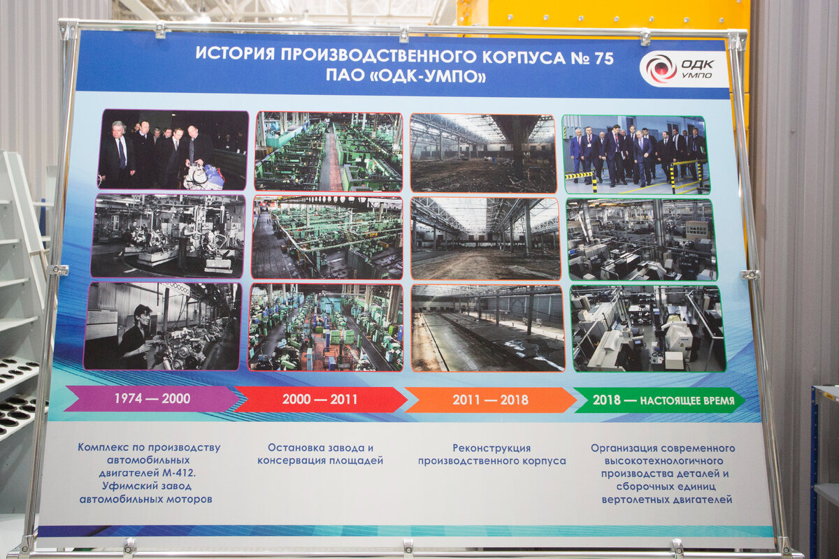 Уфимское моторостроительное производственное объединение за свою историю освоило выпуск множества авиационных двигателей от поршневых до турбореактивных, которые устанавливались на 170 типах и модификациях самолетов. Помимо этого, на предприятии выпускали редукторы для Ми-6, колонка несущих винтов вертолета Ка-15/26/32 и д р узлы и агрегаты для вертолетов. С 2018 года на предприятии начал работать производственно-технологический центр по изготовлению узлов вертолетных двигателей включая самый массовый и востребованный двигатель ВК-2500 для вертолетов «Ми» и «Ка». Новый центр после реконструкции расположился в цехе где с 1974 по 2000 производили двигатели для "Москич-412". В рамках кооперации ОДК по производству ВК-2500 за -УМПО закреплено изготовление девяти его узлов, включающих более 900 деталей и сборочных единиц что составляет 32% от всего двигателя. Все узлы и детали производятся на 4 участках на которых установлено 310 единиц новейшего оборудования, включая станки с числовым пр