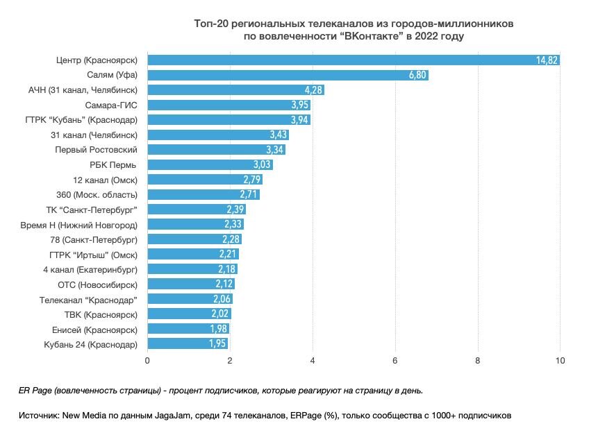 Он занял двенадцатую строчку. Телеканал «Время Н» вошел в топ-20 по вовлеченности в соцсети «ВКонтакте» за 2022 год. Исследование провели аналитики социальных медиа JagaJam, его результаты опубликованы в telegram-канале New media. В исследовании участвовали 63 группы региональных телеканалов в сети «ВКонтакте» из крупных городов с населением от 500 000 до 1 000 000 человек. «Мы активно работаем в соцсетях, — говорит главный редактор ИА „Время Н“ Александр Савельев. — Всегда ценим обратную связь и выступаем за интересный контент». Отметим, что на сегодняшний день в сообществе информационного агентства во «ВКонтакте» 6 тысяч 197 подписчиков. Кстати, сейчас на нашем сайте вещает телеканал «Волга 24» — часть большого медиахолдинга Нижегородской области, который объединяет телеканалы «Волга» и «ННТВ», а также информационное агентство «Время Н». Смотрите эфир телеканала здесь — и первыми узнавайте обо всех региональных событиях. Напомним, что «Волга 24» заработала в октябре 2021 года вместо