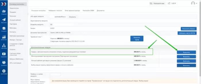 На тарифах «Новичок» и «Пользователь» рекурренты подключаются в виде дополнительного модуля, который стоит 990 рублей в месяце. Как его включить, показано на скриншоте ниже.