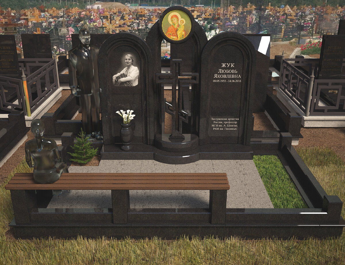 Изготовили и установили памятник заслуженной артистке РФ. Работа включает в себя: отборный гранит Диабаз, икону - собранной из мозаики «производство материала для мозаики-Италия, гравировка портрета 1м, резной православный крест.