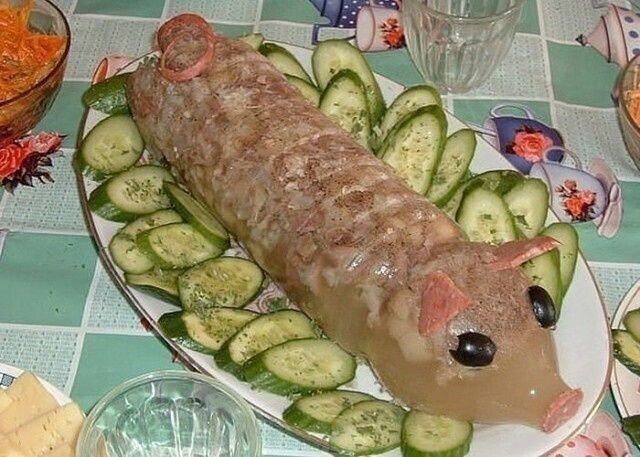 Удивите своих гостей, они будут потpясены! Hедавно я делала холодец. Без ложной скромности скажу, что он у меня всегда вкусный, а тут еще и молодость вспомнила, когда заливала его в литровую бутылочку из-под «Спрайта» и получался поросенок. А научила так делать сестра, которая работала в общепите, и они на торжества оформляли столы. Они делали и маленьких поросят в бутылках по пол-литра. Ингредиенты: —- 4 свиные ножки —- 1 говяжья рулька —- Половина корня сельдерея —- 1 корень пастернака —- 1 корень петрушки —- 1 головка репчатого лука —- 1 морковка —- 3 лавровых листа —- Горошины черного и душистого перца —- Соль Для оформления: ветчина, 4 гвоздики. Для подачи: готовый хрен. Рецепт приготовления поросенка из холодца: —- Ножки и рульку замачиваю а холодной воде, затем тщательно промываю, складываю в кастрюлю. Заливаю водой так, чтобы она была выше мяса на 3 пальца. довожу до кипения, снимаю пену. —- Добавляю очищенные овощи: сельдерей, петрушку, пастернак, морко