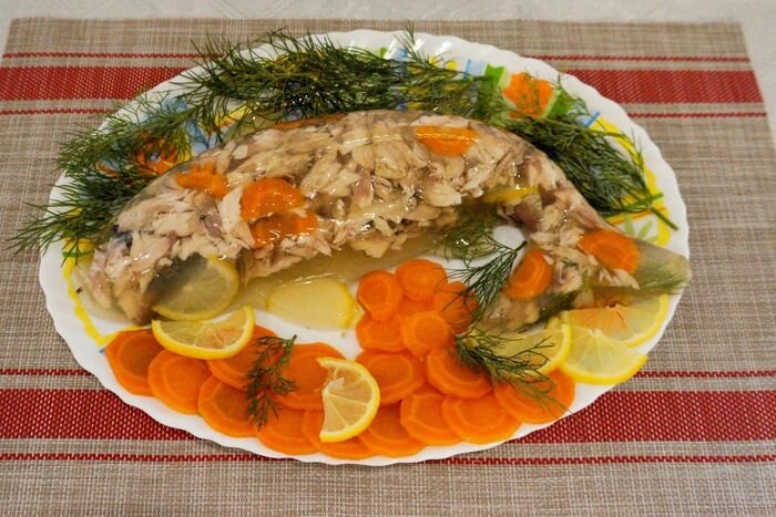 #рецепт Заливное из сазана Заливное из сазана выглядит очень красиво и аппетитно, особенно если украсить блюдо композицией из вареных овощей, зелени и лимона. Вкусное и красивое заливное из сазана будет отлично смотреться на праздничном столе. Блюда из сазана всегда были предметом гордости хозяев. Это оригинальное блюдо, приготовление которого сможет освоить даже начинающий кулинар. Порций: 6 Время приготовления: 4 ч. 50 м. (Подготовка продуктов 15 минут, варка сазана и овощей 40 минут, время застывания 4 часа) Ингредиенты (6 порций) - Вода холодная — 1.5 л - Лавровый лист — 1 шт. - Лимоны — 1 шт. - Лук репчатый — 1 шт. - Морковь — 1 шт. - Перец душистый горошком — 5 шт. - Рыба сазан — 400 г - Соль — по вкусу - Укроп свежий — украсить Приготовление: 1. Для заливного понадобится голова сазана, хвост и стейк. Голова сазана считается одной из самых вкусных его частей. Жабры стоит удалить. 2. Морковь хорошо промыть под проточной водой и очистить. Луковицу очистить от шелухи. Слож