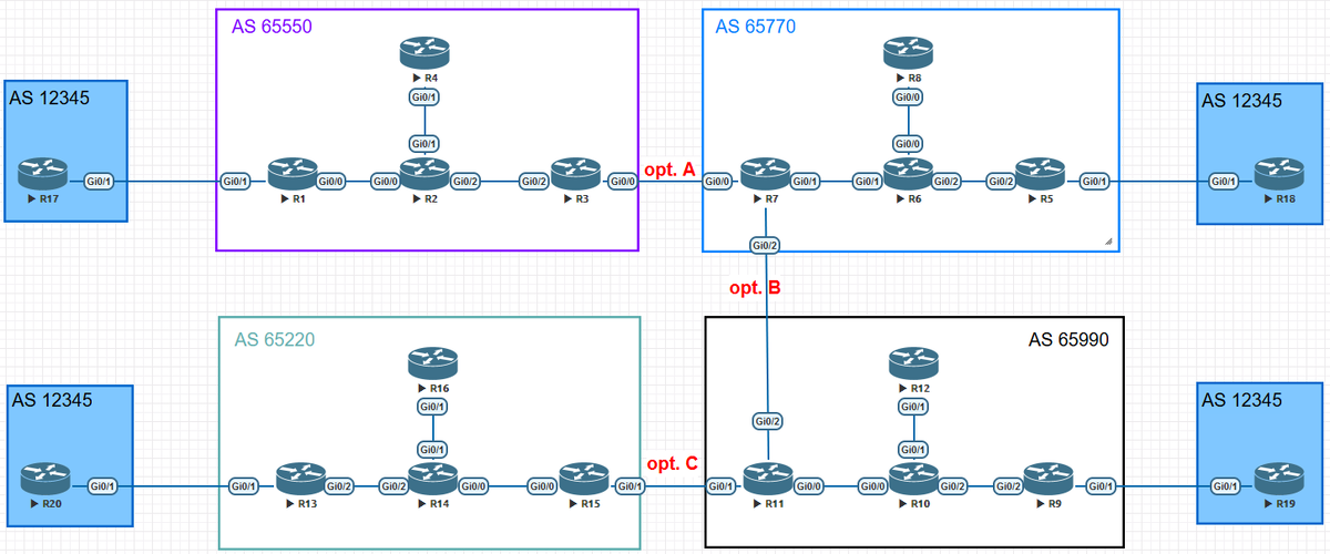 В данной топологии имеем 4 AS: 65550, 65770, 65990 и 65220, выполняющих роль различных Интернет провайдеров, и четыре роутера (R17-R20) Клиента компании "Sky", которой нужна услуга L3 VPN между всеми филиалами.
