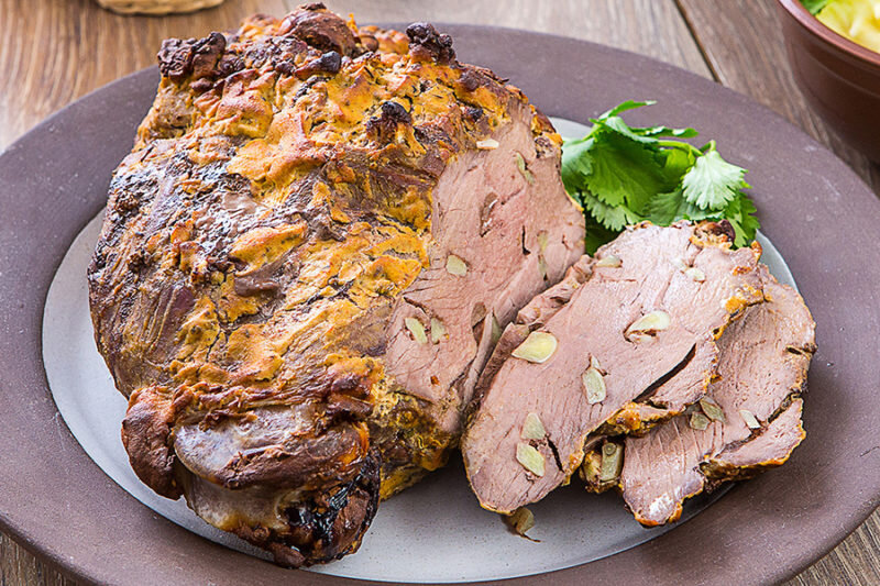 Ногу баранины нашпекуй толстыми полосками свиного сала, обернутого в мелко истолченные душистые травы, с головкою чесноку, солью, перцом, тертым мускатным орехом и одним анчоусом; обвяжи нитками и положи в жаровню с несколькими ломтиками свиного сала сверху. Прибавь морковей, луковиц, пучок душистых трав и соли. Смочи водою столько, чтобы нога покрылась оною.