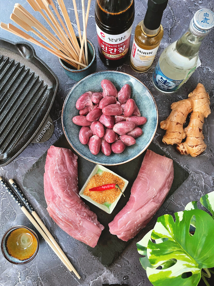 ИНГРЕДИЕНТЫ Японские шашлычки любят во всем мире! Ну, а как не любить? Вкусно, быстро и просто! «Кусияки» - название произошло из двух слов: «куси» - палочка из бамбука, «яки» - обжарка, готовятся из: - свинины /кусияки буто/ - лосося /кусияки саке/ - креветок /кусияки эби/ Самые популярные кусияки готовятся из курицы и называются якитори в переводе с японского «жареная курица». К общему названию якитори добавляется приставка, которая обозначает из какой части курицы приготовлен шашлык. Так якитори хацу означает, что пожарены сердечки. Сердечки очистила от лишнего жира и отрезала крупные сосуды. Шпажки замочила в воде. Вырезку тоже очистила от плёнок и жира, нарезала на медальоны, а потом на половинки. Приготовила маринад. В ковш насыпала тростниковый сахар, влила соевый соус. Поставила на огонь, вскипятила, подождала, когда сахар полностью растворится, добавила нарезанный чили перец с семенами и имбирь. Уварила соус до загустения, а затем процедила. Влила мирин и саке. Маринад