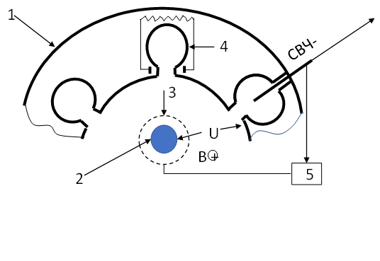 Мой взгляд на некоторые вещи ДРУГОЙ ПОДХОД К СОЗДАНИЮ СВЧ УСТРОЙСТВ Речь пойдет об СВЧ приборах, в частности о приборах со скрещенными полями. Способ создания СВЧ колебаний нормированной мощности, и получения более качественных характеристик излучения (например, монохроматичность), основан на введение дополнительного электрода в пространстве между катодом и анодом. Применение дополнительного электрода позволит создавать необходимый по величине объёмный заряд (получение заданной мощности излучения) и возможность модулирования объемного заряда, на «рабочей» частоте устройства (улучшение монохроматичности). Модулирование можно обеспечить как за счет обратной связи, на дополнительный электрод, так и при помощи внешнего устройства (генератора). Рассмотрим это на примере магнетрона. На рисунке 1 изображена часть конструкции магнетрона, с дополнительным элементом в виде цилиндрической сетки, соосной с катодом накаливания (источник электронов). Рис.1. Где: 1-анодный блок; 2-катод; 3- дополни