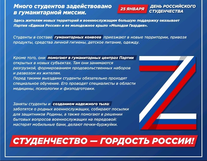 25 января отмечается День российского студенчества. В этот день в 1755 году в день мученицы святой Татианы императрица Елизавета Петровна подписала указ «Об учреждении Московского университета». В 18 и первой половине 19 века праздник был исключительно университетским. Позже его начали отмечать все представители студенчества. Студенты во все времена были опорой государства. Способность студенчества сплотиться в кризисные для страны моменты не раз помогала стране пережить темные времена. #ЕР, #ДеньСтудентаЕР