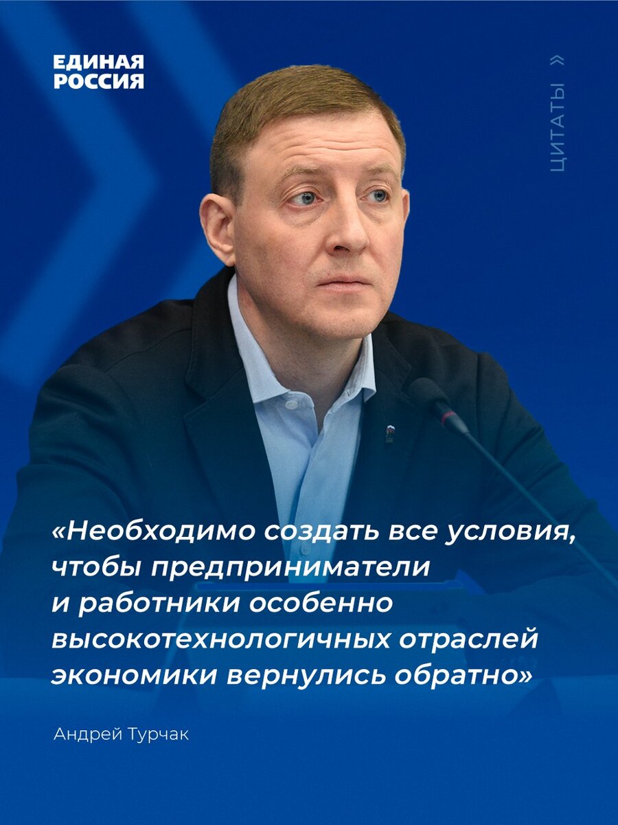 Секретарь Генсовета Единой России Андрей Турчак призвал предпринимателей и работников высокотехнологичных отраслей экономики, которые уехали из России, вернуться на Родину. «Наша задача сделать все и создать все условия для того, чтобы те, кто по каким-то причинам уехал - семейные обстоятельства, смалодушничал - но готов вернуться и работать на свою страну и экономику, могли вернуться обратно. Особенно это касается высокотехнологичных отраслей экономики.