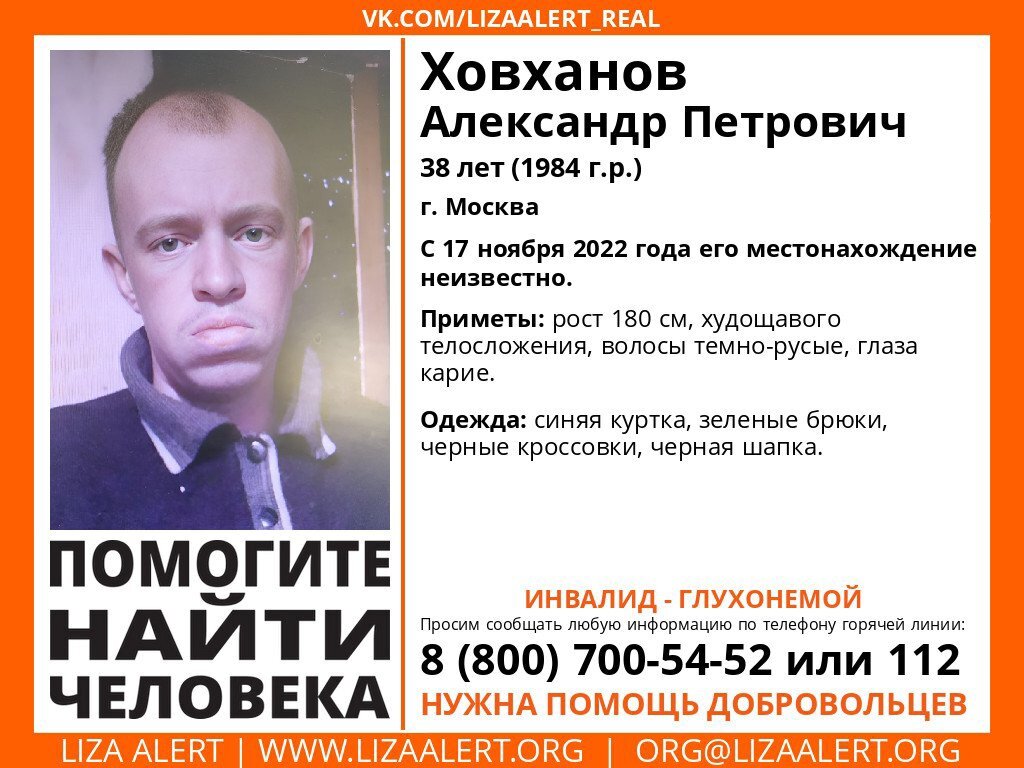 В Липецкой области ищут 38-летнего глухонемого мужчину, который пропал в Москве два месяца назад. О местонахождении Александра Петровича Ховханова ничего неизвестно с 17 ноября 2022 года. — Помогите найти человека, — обратились волонтеры регионального поискового-спасательного отряда «Лиза Алерт». — Может находиться в Липецкой области. Приметы пропавшего: рост 180 сантиметров, телосложение худощавое, волосы темно-русого цвета и карие глаза. В день исчезновения Александр Ховханов был одет в синюю куртку, зеленые брюки, черные кроссовки и черную шапку. Если вы видели похожего мужчины, волонтеры просят сообщить на телефонам — 8-800-700-54-52 или 112.