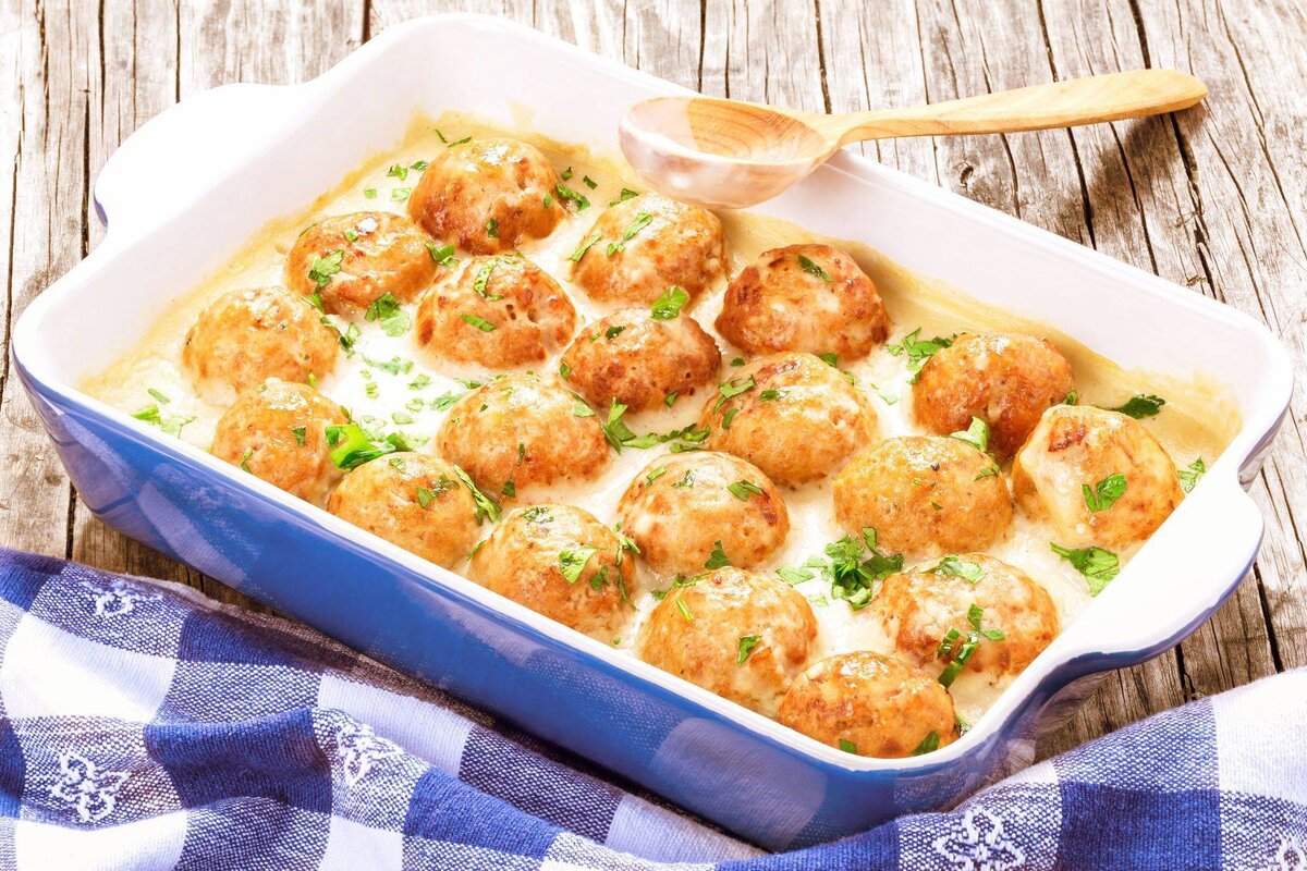 Ингредиенты: Приготовление: 1. Из свинины и куриной грудки приготовьте фарш, добавьте в него соль, перец, чеснок и по желание любимые приправы. 2. Рис сварите до готовности или полуготовности. 3. Перемешайте рис с фаршем. 4. Сформируйте круглые тефтели. 5. Для приготовления сливочного соуса соедините сливки с 2/3 тертого сыра, ароматными травами. 6. Поместите тефтели в смазанную форму, залейте сливочным соусом и запеките в духовке при 200 градусах около 40 минут. 7. Готовые горячие тефтели посыпьте оставшимся тертым сыром. Подавайте с гарниром из картофельного пюре. Приятного аппетита!
