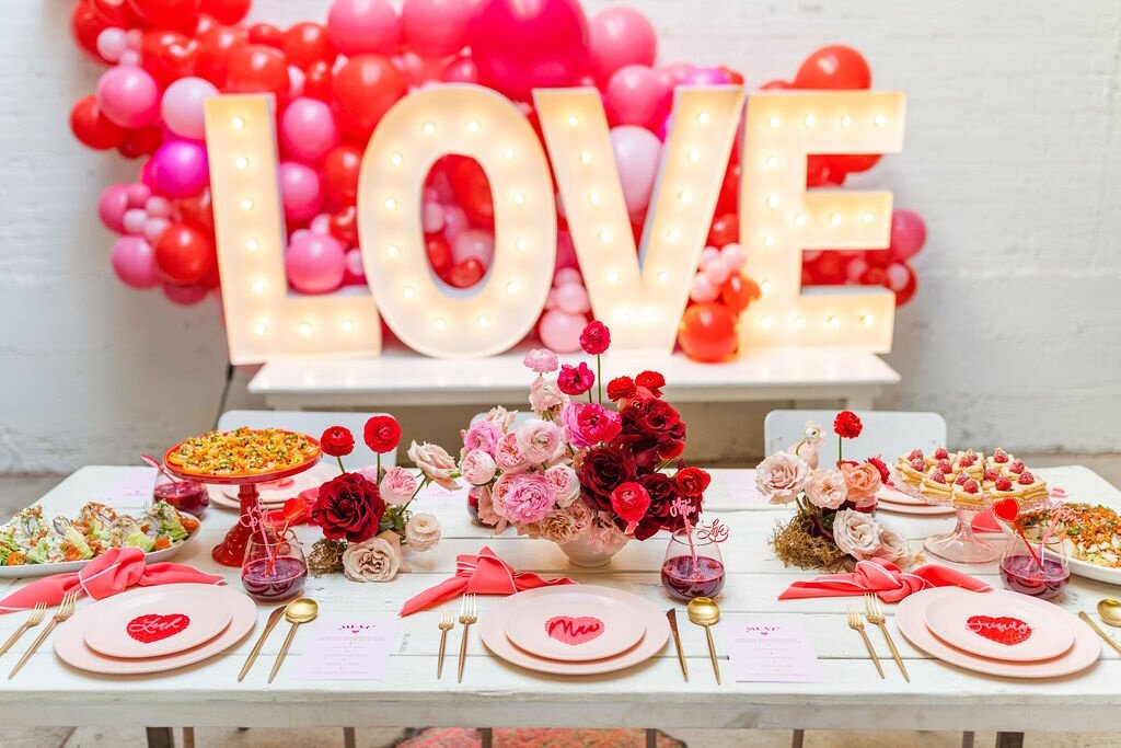 Мы показали вам уже множество Дней святого Валентина для девочек, теперь делимся идеей для мам! Ведь и нам нужно отдохнуть за бокалом вина вместе с подругами. Также идею можно использовать для вечеринки пар или устроить такой ужин на двоих. А декор и посуду для оформления ищите тут. Сервировка была минималистичной: нежные розовые тарелочки, золотые столовые приборы, розовые бокалы и никакой скатерти! Стол украсили букеты из роз разных оттенков. Специально для праздника заказали акриловые палочки для коктейлей и именные таблички. Посмотрите, какая красотища! И ведь для декора нужна лишь посуда и цветы. Задний фон украсили буквы-светильники и гирлянда из шаров. Все это можно заказать в аренду для вашей вечеринки! Мам ждали самые изысканные угощения: слойки с малиной и хлопьями золота, бисквитный розовый торт и коктейли с перламутровым пищевым красителем! Источник: beijosevents.com