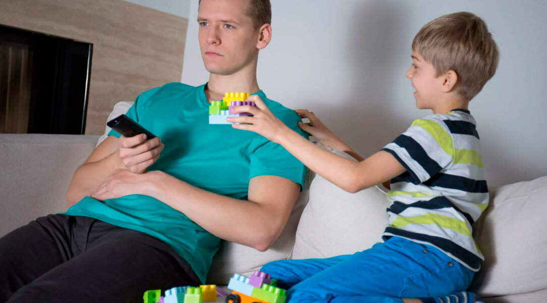 Ребенок: «Мама, ты придешь поиграть со мной? Мама: «Не сейчас, разве ты не видишь, что я занята?» Папа смотрит телевизор.