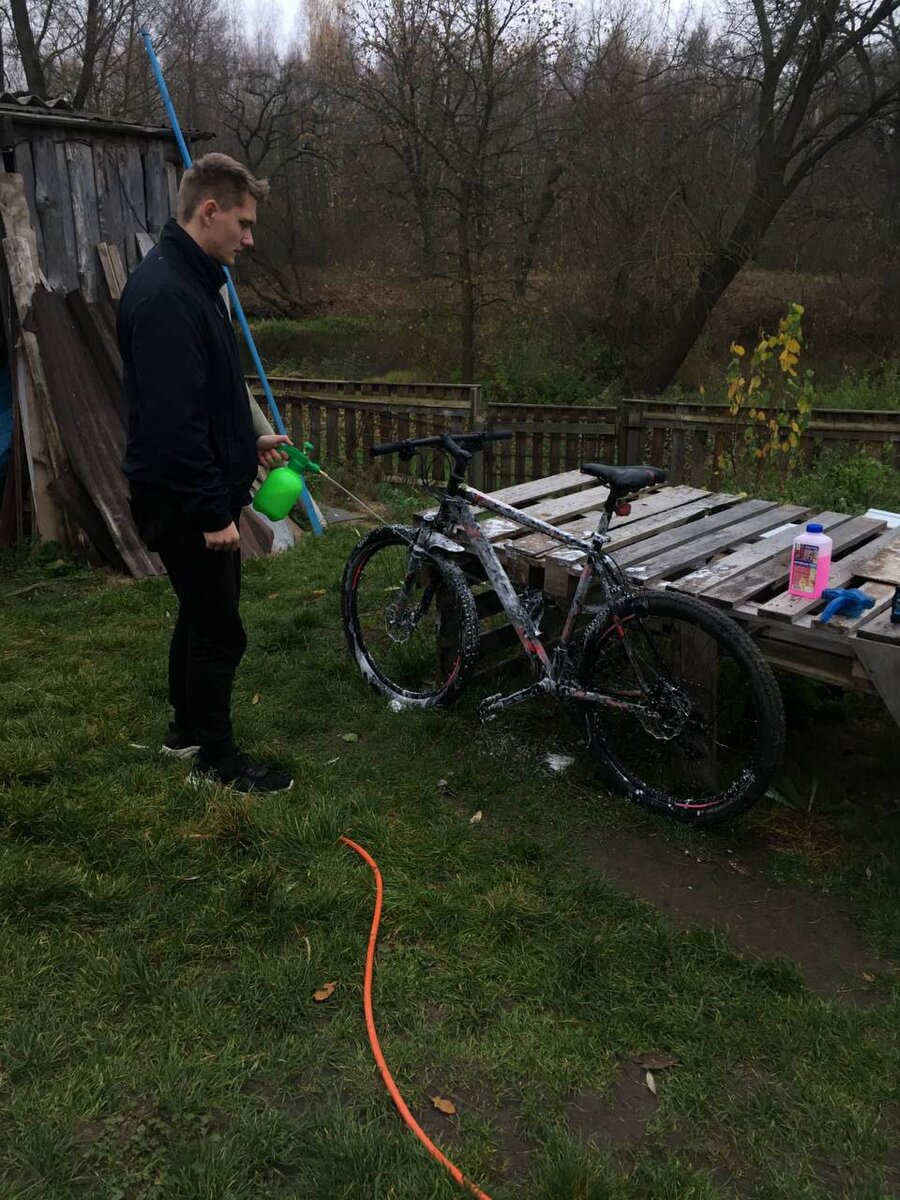 Всем привет! Сегодня я хотел бы поговорить на очень хорошую тему как мойка велосипеда.Я лично велосипед мою исключительно дома(на автомойках не рекомендуется особо) и хотел бы рассказать как же качественно и быстро помыть свой байк. Вообще автомойки хороши тем,что там там можно велосипед запенить,но я нашел решение как можно запенить свой велосипед дома.Нам понадобиться обычный садовый опрыскиватель и он очень хорошо справляется со своей задачей,пении просто идеально(только его нужно немного подколхозить,чтобы он пускал исключительно пену.Забейте на Ютубе как сделать из опрыскивателя пеногенератор).И начинаем обильно наносит нашу пену на байк(в качестве пены использую автошампунь,хотя в народе ещё использую Фери) После того как нанесли пену,нужно немного подождать,чтобы наша пена подействовала и разъела нашу грязь.Спустя минуты 3 все можно смывать. Затем,когда мы все уже смыли,велосипед следует протереть насухо обычной,сухой тряпочкой. Дальше надо было бы почистить нашу тран