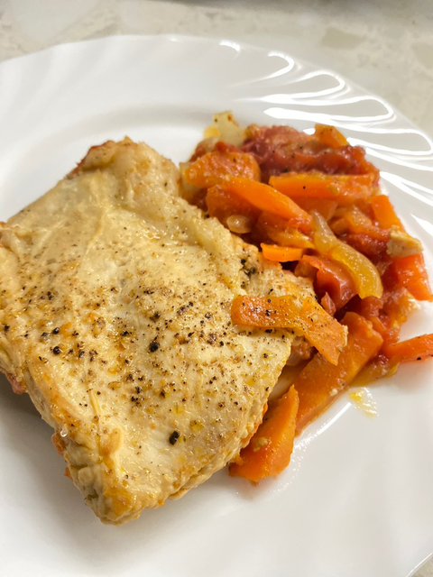 Обжарить на этой же сковороде на подсолнечном масле лук. Затем к Луку добавить морковь и перец. Через 5 минут добавить томаты и стейки индейки.