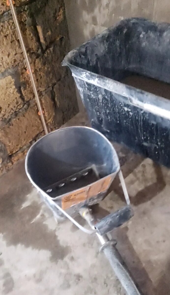 Всем привет, господа. Хочу поделится своими успехами освоения штукатурных работ. Ютуб и гугл помогли найти такое устройство как Хопер ковш. Далее по порядку. - Отбил лазером уровень штукатурки, соблюдая угол 90 градусов. - Разметил места маяков. - Просверлил отверстия под дюбеля. - По уровню закрутил саморезы и закрепил маяки на специальные крепления. Всё получилось ровненько по уровню. Маяки использовал пластиковые, что бы не доставать их и похоронить в стенке. Далее замесил раствор, смочил места штукатурки. И принялся за работу. Стена по вертикали чем выше стала уходить в сторону улицы, и верхний слой получился больше чем нижний. Нижний я сделал на чистую, верхний нанёс один слой и оставил что бы взялся, потом буду наносить второй, возможно и третий. Вышло идеально. На мой взгляд. Спасибо за внимание! Если зайдёт, буду дополнять. Работаю у своего коллеги по основной работе. Кому интересно, прилагаю видео с Ютуба. Работа самим ковшом. Комментарии к посту на сайте Пикабу.
