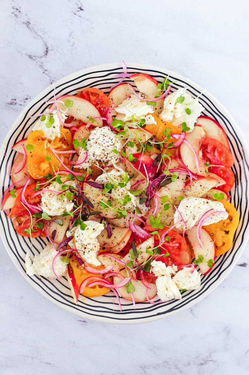 Идеальный итальянский летний салат уже ждет вас! Сливочный, мягкий сыр буррата великолепно сочетается с терпкими сочными помидорами и сладкими сочными персиками. Это сочетание как никакое другое и к тому же красивое. Узнайте, как приготовить его дома... Когда я ищу салат, я неизменно обращаюсь к Италии. Ни в одной другой стране нет таких свежих и простых ингредиентов, как в Италии - сочетание вкусов, текстур и цветов у них в крови. Здесь всегда предлагается простая, честная еда, которая удовлетворяет всем требованиям. Этот салат - один из моих любимых во все времена; в нем прекрасно сочетаются сладкое и соленое. Сочные персики в сезон непревзойденны, а в сочетании с терпкими сортовыми помидорами превращаются в нечто особенное! Но есть еще один ингредиент, который поднимает этот салат еще выше... Буррата - король сыра? Да! Буррата - это, возможно, мой любимый итальянский сыр. Мягкая моцарелла bufala, начиненная stracciatella di bufala (очень мягкая измельченная моцарелла bufala). Роскош