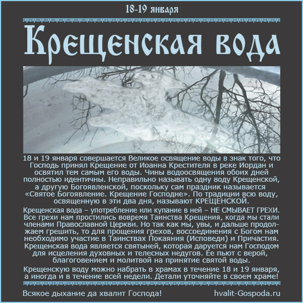 19 января все православные христиане будут праздновать Крещение Господне. В сам день праздника и накануне, 18 января, традиционно будет проходить Великое освящение воды. Рассказ о Крещенской воде можно СКАЧАТЬ, РАСПЕЧАТАТЬ И ПОВЕСИТЬ в храме, воскресной школе или в подъезде (PDF-файл, 1 страница А4). http://hvalit-gospoda.ru/o-kreshhenskoj-vode/ Чины водоосвящения обоих дней полностью идентичны. Изначально, до XVI-XVII веков, Великое водосвятие совершалось только накануне Крещения Господня, а во времена Патриарха Филарета был установлен повтор этого чина в сам праздник. Сила освящения этой воды абсолютно одинакова. ЧИТАТЬ НА САЙТЕ... Мы в Телеграм, Елицы, Вконтакте, Одноклассниках Поддержите проект лайком, перепостом или посильным переводом: карта СБ 5336690117772279, yoomoney, boosty.to, cloudtips.ru