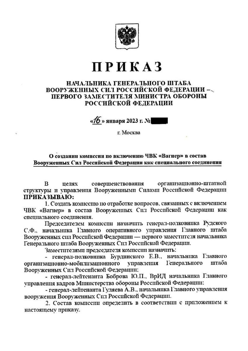 В Сеть утек приказ предположительно начальника Генштаба ВС РФ Валерия Герасимова, согласно которому ЧВК "Вагнер" планируется включить в состав ВС РФ