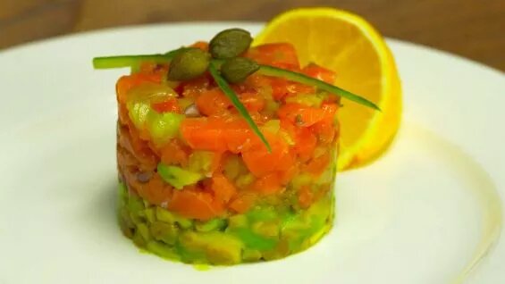 - Выкладывать тартар в два слоя, первый слой выкладываем авокадо, второй слой рыба с овощами. Сверху можно украсить тонкими полосками огурца, перьями зеленого лука и каперсами.