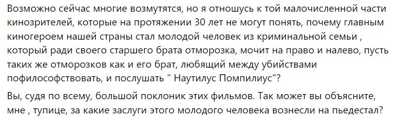 Давайте как следует разберемся. Не так давно я получил очень хороший, подробный комментарий, на который решил ответить полноценной статьей. Конечно же, речь здесь идет про Данилу понимаете ли Багрова. А вот что пишут другие подписчики. Шедевры Алексея Октябриновича Балабанова сотканы из полутонов. Понимаете, чтобы попробовать если не постичь Балабанова, то хотя бы к нему приблизиться, нужно посмотреть все его фильмы без исключения. Они сняты нарочито просто, многие актеры играют небрежно, диалоги заведомо примитивные. Но в действии зашит чрезвычайно глубокий смысл, и все это положено на замечательную русскую рок-музыку. На мой взгляд, Данила Багров не хороший и не плохой. Лично я его никогда не считал киногероем. Данилу нельзя назвать положительным персонажем, но нельзя и отрицательным. О нем вообще трудно писать и оценивать его поступки объективно. Данила пришел с войны, где повидал всякого и привык решать вопросы силой. По ходу действия "Брата" и "Брата-2" он совершил ряд не только п