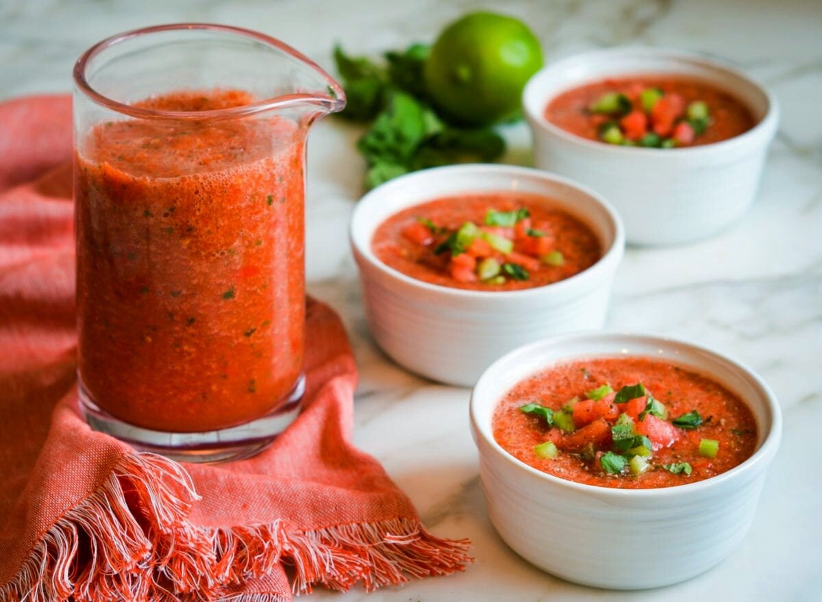 ИНГРЕДИЕНТЫ/6 ПОРЦИЙ: 450 г томатов, 1 репчатый лук, 1 консервированный перец, 1 огурец, 3 ст. томатного сока, 100 г кинзы, 70 г красного винного уксуса, 50 г оливкового масла, табаско — по вкусу