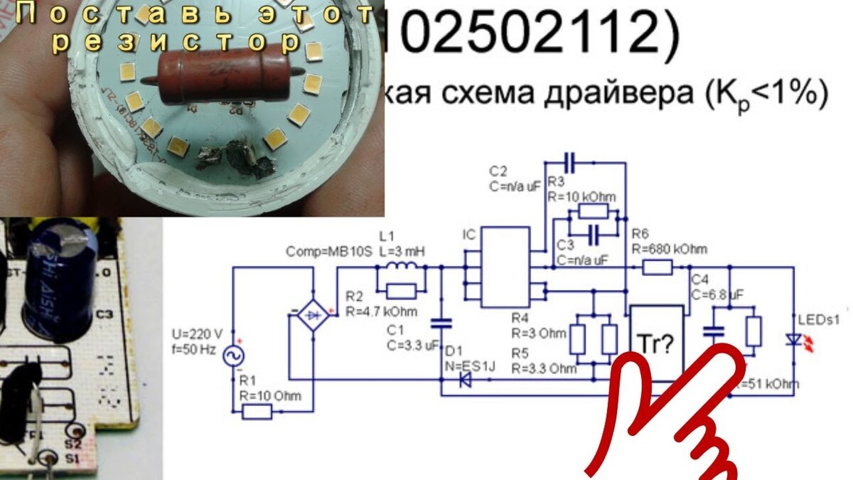 Чтобы светодиодная лампочка дольше у вас прослужила, есть несколько способов её доработать и самый простой-это припаять сопротивление 22-51 кОм 2 Ватт прямо на плате светодиодов. Вот на схеме ниже он нарисован, но его не ставят, по причине, чтобы ваша лампочка долго не проработала и чтобы через время вы пошли покупать новую. на схеме нарисован резистор 51 кОм, но у меня стоит 22 кОм, до этого я уже два раза закорачивал перемычкой перегоревшие светодиоды, думая, если драйвер лампы стабилизирует по току, значит лампочка будет работать и дальше. Но не тут то было, за одним светодиодом перегорел и другой, пока не поставил вот это сопротивление. Что делает полезного этот резистор? Конечно он разряжает выходной конденсатор электролит, а так же он гасит все скачки напряжения, которые могут быть в сети. Вы скажете, что не проще было бы выпаять из схемы один из резисторов R4 или R5 номиналом по 3 Ом, которые стоят параллельно друг другу, этим мы уменьшим напряжение на светодиодах! Да, можно так