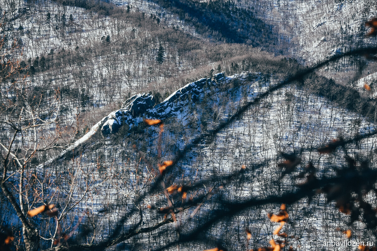 Многие туристические достопримечательности носят интересные названия. Иногда их связывают с легендами и сказками. Одно из таких мест – «Парк драконов», состоящий из нескольких скальных массивов. Название эта достопримечательность получила из-за схожести каменных выступов со спинами драконов. Когда смотришь на эти массивные горные хребты, то и дело представляется огнедышащее сказочное существо, уснувшее здесь среди сопок и деревьев много лет назад. Маршрут к «Хребтам драконов» несложный и составляет около 1,5 километра в одну сторону. Единственное, что может затруднить передвижение в зимнее время года, – недавно выпавший снег. Обычно дорожка протоптана туристами, но могут иногда попадаться места, где придётся пробивать снежный покров, уходя в снег по колено. Начинается тропа от моста в селе Чистоводном. Кстати, с дороги уже хорошо виднеется финальная точка маршрута в виде скального массива. Вначале предстоит преодолеть довольно затяжной подъём. Тропинка петляет среди деревьев и спустя