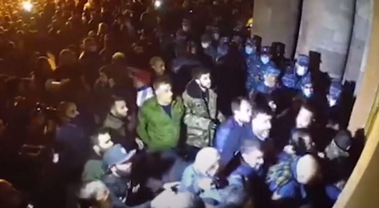 Двоих участников массовых беспорядков, произошедших в Ереване в ночь на 10 ноября 2020 года после подписания трехстороннего заявления по Нагорному Карабаху, арестовали на 2 месяца, сообщает СНБ Армении. Согласно материалам дела, А. Б. участвовал в избиении Арарата Мирзояна, который тогда занимал пост председателя Национального собрания. В результате побоев Мирзоян потерял сознание и был доставлен в медцентр «Эребуни». Т. П. обвиняется в участии в беспорядках и в краже из резиденции премьер-министра золотых украшений на сумму 3,92 млн драмов – золотых часов, браслетов и медальонов, принадлежащих супруге главы правительства Анне Акопян. Сообщается, что золотые украшения Т. П. впоследствии заложил в двух филиалах организации «Фаст Кредит». В Ереване в ночь на 10 ноября 2020 года, сразу после того, как было обнародовано совместное заявление премьер-министра Армении и президентов России и Азербайджана о прекращении боевых действий в Нагорном Карабахе, начались массовые волнения. Протестующи