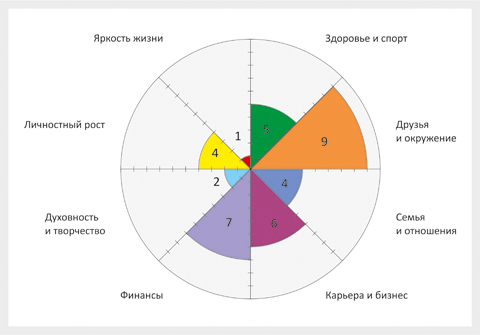 Каждый сектор «Колеса жизни» должен быть заштрихован в соответствии с выставленными оценками. Дальнейший анализ базируется на двух критериях: