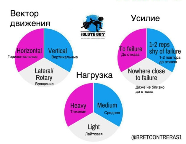 В 1/3 упражнений (для ягодичных) векторы нагрузки должны быть горизонтальны, в 1/3 – вертикальны и в оставшейся 1/3 – латеральные(боковые)/вращательные движения. Рабочие веса в 1/3 упражнений должны быть достаточно высоки, а число повторов мало; 1/3 – умеренные отягощения для среднего диапазона повторов; 1/3 – многоповторка с легкими весами. Интенсивность: 1/3 рабочих подходов следует доводить (почти) до отказа, 1/3 – трудные, но в запасе пара повторов до отказа, оставшаяся 1/3 – никакого отказа.