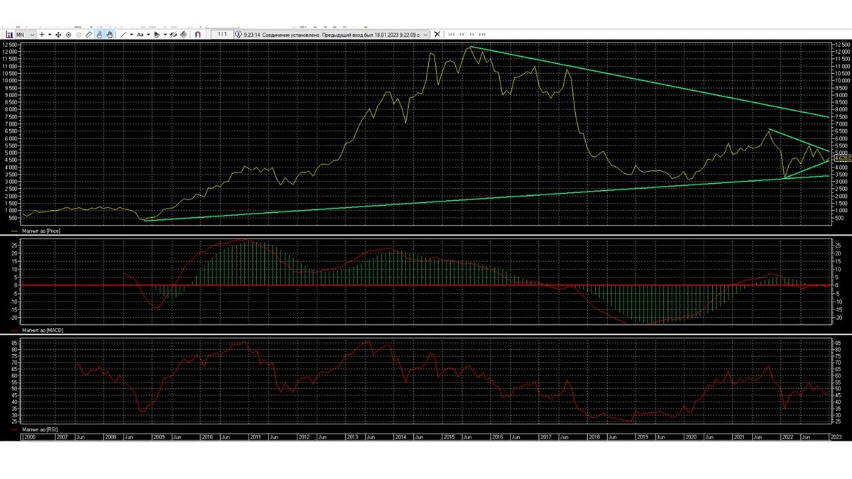В настоящее время акция Магнита на рынке смотрится не плохо, даже можно сказать лучше, чем другие акции. Начиная с 24 февраля 2022 года просела не сильно, после вернулась на старые уровни, на которых торгуется с лета 2020 года. Даже пробует расти и закрепиться выше уровня 5000, но сейчас по техническому анализу торгуется в широком боковом коридоре 2500-7000. В 2022 году компания Магнита не платила дивиденды, скорее всего по этой причине компания Магнит не вернулась на уровень 7000, после 24 февраля 2022 года. В 2023 компания Магнита планирует провести выплаты своим акционерам в размере 244,2 рублей на одну акцию, выплату дивидендов провести 7 июля 2023 году, закрытие реестра провести 25 июня 2023 году. Окончательный вопрос по выплатам дивидендов поставит собрание акционеров, которое пройдет весной этого года. Сейчас с помощью технического анализа рассмотрим движение акции Магнита до конца февраля. Месячный график показывает, начиная со второй половины 2017 года акция Магнита сделала п