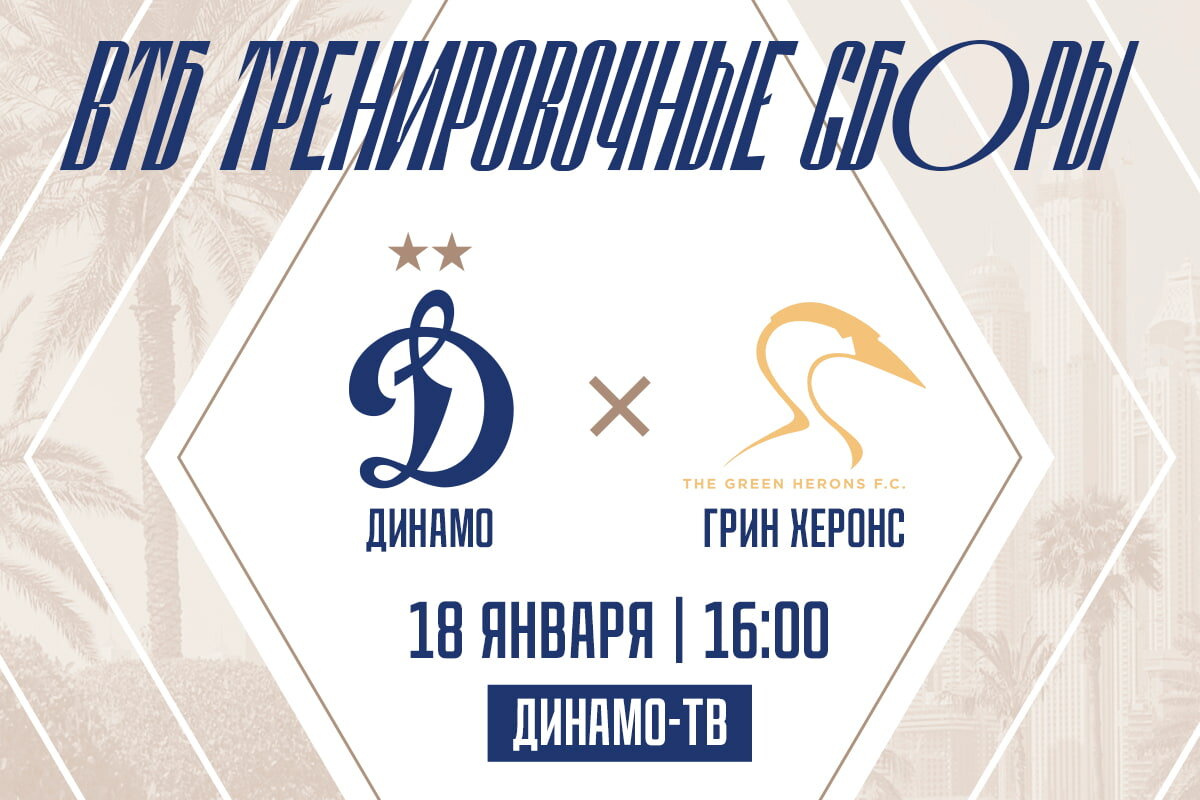 В среду, 18 января 2023 года, состоится первый матч на зимних «ВТБ тренировочных сборах» между московским «Динамо» и дубайской командой «Грин Херонс». Когда начало и где смотреть За текстовой трансляцией встречи можно будет следить онлайн в нашем матч-центре. Видеотрансляцию этой игры в прямом эфире вы сможете посмотреть на нашем канале в YouTube в группе «Динамо» в социальной сети ВКонтакте. Начало матча в 16:00 по московскому времени. После игры мы выложим подборку лучших моментов матча, а за жизнью команды на сборах вы сможете следить в выпусках традиционной программы «В Сборе». Состояние команды Динамовцы в прошлый четверг прилетели в Абу-Даби в расширенном составе из 32 человек, в который попали многие молодые футболисты из второй команды. Впервые на сборы с основой Славиша Йоканович взял защитников Станислава Бессмертного и Яна Цеся, хавбека Максима Александрова и вингера Дениса Бокова. Постепенно в команде обживается единственный иностранный новичок Милан Майсторович. 17-летний