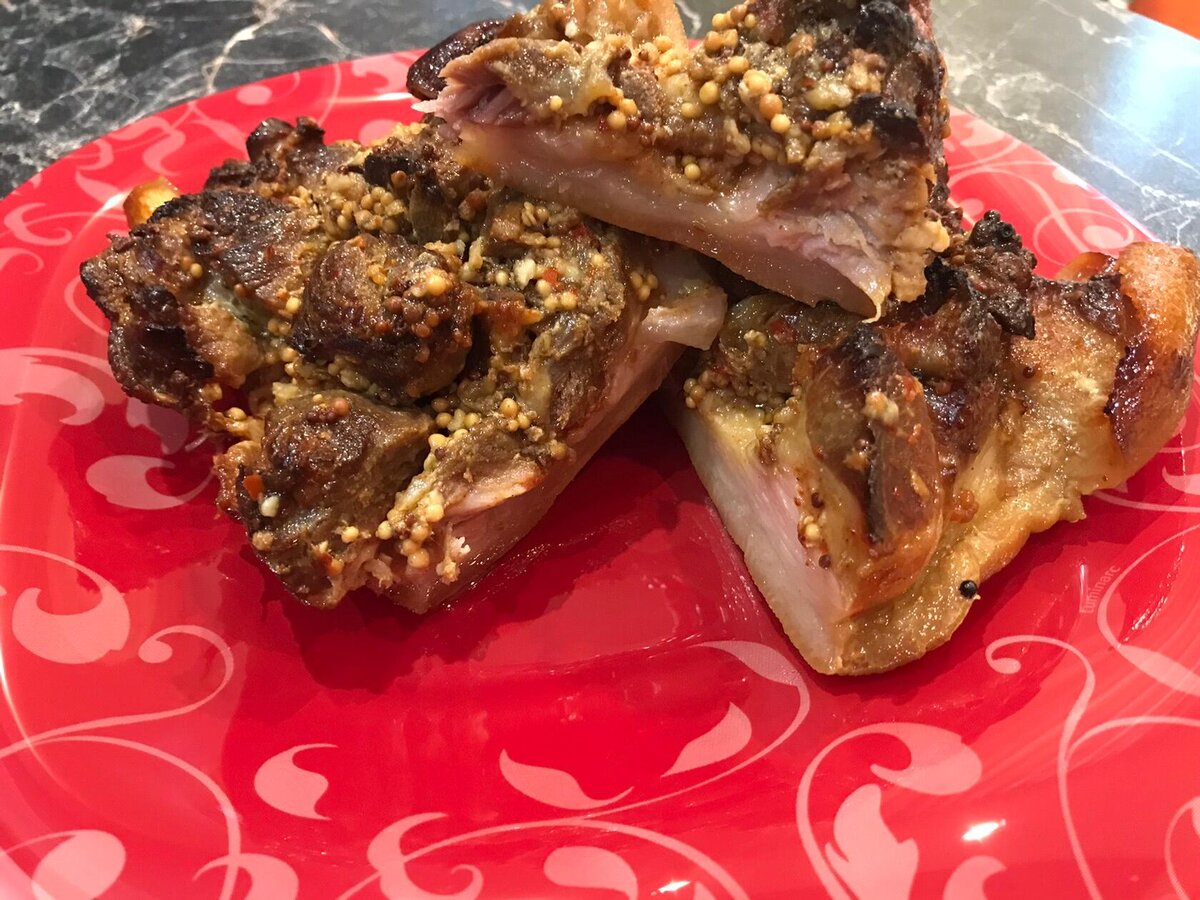 Бюджетное и очень вкусное мясо на горячее. Рулька, запеченная в рукаве не доставит никаких хлопот в приготовлении. Это блюдо очень ароматное, сочное и аппетитное. А блюда , приготовленные в рукаве, экономят наше время и силы. Минимум телодвижений и минимум грязной посуды. Обязательно попробуйте, это очень вкусно! Итак на понадобится: Рулька свиная 1шт (выбирайте помясистее) Для маринада: Мёд жидкий 1ст. ложка Бальзамический уксус 2ст. ложки Горчица зернистая 1ст. ложка Чеснок 4 зубчика Соль/любимые приправы Сначала острым ножом нужно поскрести кожу рульки, счищая оставшиеся волоски и копоть , которые иногда остаются после опаливания. Нам нужно извлечь кость из рульки. Делаем продольный разрез, и аккуратно, подрезая мясо вдоль кости, высвобождаем нашу рульку. Получившийся пласт надрезаем в мясных местах на кубики, не доходя до кожи. Самое сложное сделано. Теперь берем любимые специи, и обязательно чеснок. Я добавила столовую ложку меда, 2 столовые ложки бальзамического уксуса, соль, че
