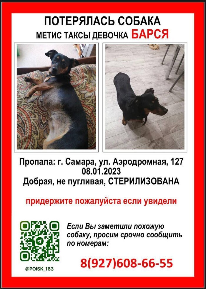Уважаемые пикабушники! Это пост отчаяния! Самарцы, пожалуйста, прочитайте пост! Уже 10 дней наша Барси где-то бродит одна, в холоде, и нет человека, кто бы ее заметил. Потерялась в районе Аэродромная/Промышленности, но сейчас уже может быть где угодно ((. Жизнь нашей семьи превратилась в АД, круглосуточный поиск, надежда сменяется отчаянием, чувство вины гложет, мы делаем всё что можно, но безрезультатно (((Мы получали информацию и мчались проверять, но поздно, она успевала уйти... Она точно жива, по другому не может быть! Барси сорвалась с поводка из-за салюта, мы ответственные владельцы, но она испугалась и убежала в шоке от звука... Барси МЕТИС ТАКСЫ, она не пригодна к разведению, ей 6 лет, есть проблемы со здоровьем, требуется постоянный приём лекарств! МЫ ГАРАНТИРУЕМ АНОНИМНОСТЬ И ВОЗНАГРАЖДЕНИЕ! И мы будем очень благодарны приютившим её людям, но она имеет право вернуться в семью! Мы купим вам щенка, если захотите, взамен Барси! Обещаем ВОЗНАГРАЖДЕНИЕ 10 000 рублей за достоверную