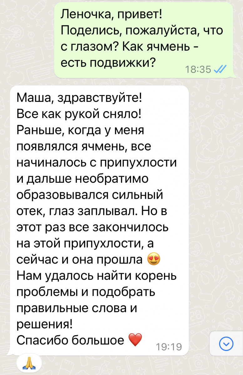 Елена рассказала, что ячмень у неё был не раз – появлялись аналогичные болезненные ощущения, потом воспаление усиливалось, глаз опухал. Это продолжалось 7-10 дней, симптоматическое лечение, как правило, облегчение не приносило, на сроки восстановления не влияло. Когда в этот раз появились первые симптомы, Лена решила исследовать их с психосоматической точки зрения, так как мы до этого уже работали с другими симптомами, подход оказался близок для Лены и у неё были хорошие результаты. У меня оказалось свободное окошко, и мы сразу начали работать.