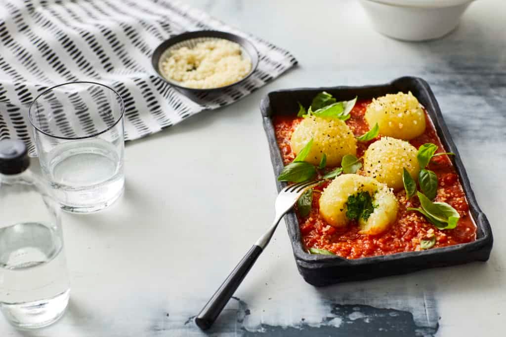 Клецки со шпинатом — отличный обед для всей семьи. Готовим их из готового теста для картофельных клецек и замороженного шпината. Термомикс® делает свою работу. Также есть вкусный томатный соус. Ингредиенты - 60 г пармезана кусочками