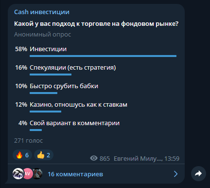 Провел сегодня опрос у себя в телеграм канале: какой подход используют мои подписчики. Смотрим что получилось: Радует, что более 55% имеют инвестиционный подход. Спекуляции по стратегии почему бы и нет. А вот быстро срубить бабла и казино - тут более 20% участвующих в опросе. С таким подходом, 90% что через какое-то время на счету будет 0, метаться, нервничать, еще и дома наверно из-за этого проблемы. Кто-то относится, как к ставкам — это игромания, главное, что бы окружающие не страдали, а человек вправе делать, что ему угодно. И когда меня спрашивают, куда вложить деньги, что бы завтра было 100%, ответ один "ставьте на красное или зеленое". Желание получить легкие деньги, приводит к еще худшему фин. положению. Тут рядом и пирамиды, и различные проекты. Фондовый рынок — это работа, только с таким подходом можно тут зарабатывать, постоянно прокачивая внутри себя качества. Фондовый рынок — это когда есть лишние деньги, а никогда продается квартира, чтобы заработать. Спросив человека "