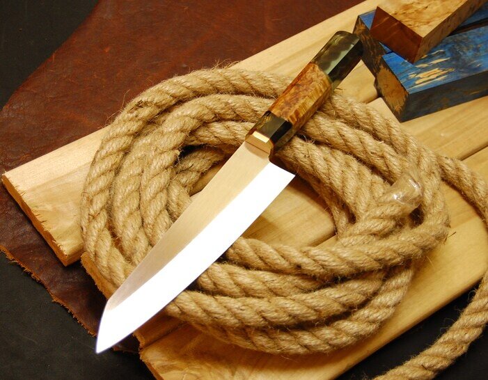 Клинок из нержавеющей Bohler N690, толщиной 2, 5 мм. Гибрид из слома стабилизированной карельской березы и пенькового троса, залитого слегка подкрашенным в голубой цвет акрилом. Больстер из латуни с фрезерованной посадкой под клинок. Проставка между больстером и основной рукоятью из красной фибры. Форма рукояти в сечении - восьмигранник.