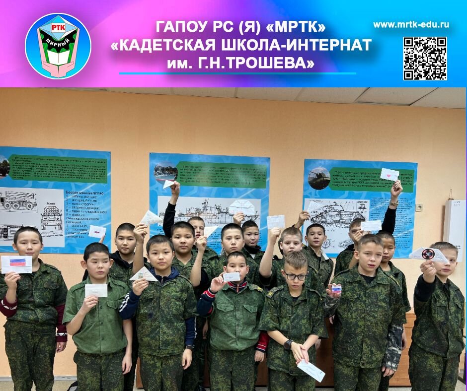 18 января 2023 г. учащиеся ГАПОУ РС (Я) «МРТК» филиала «Кадетская школа-интернат им. Г.Н. Трошева» приняли участие во Всероссийской акции «Письмо солдату», в ходе которой дети отправляют письма и рисунки для российских военных, участвующих в специальной операции на Украине.