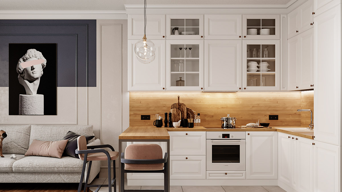 В классических и неоклассических интерьерах белый цвет усиливает эффект изысканности, а в интерьерах сканди и минимализма создает визуальный порядок. Альтернативой белому будут более спокойные кухни цвета молока или слоновьей кости.