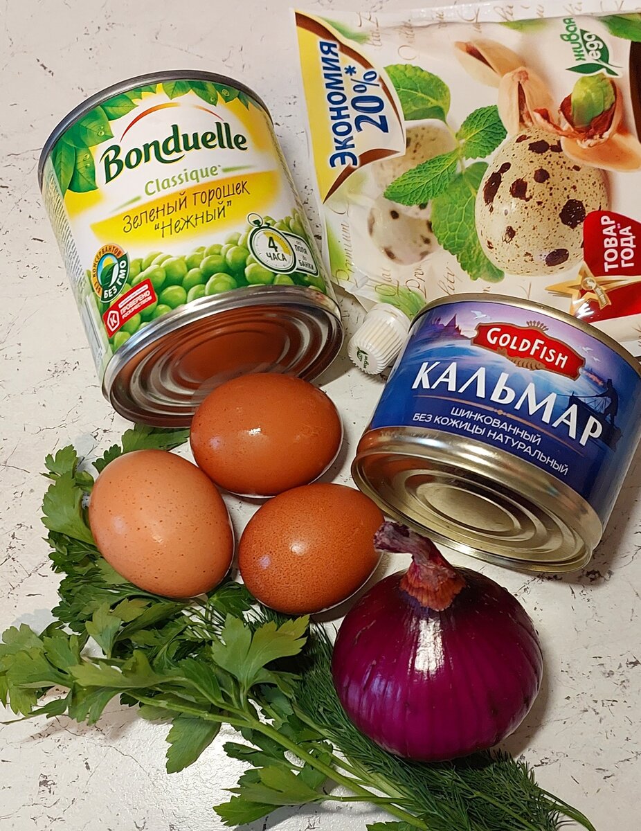 Яйца необходимо отварить и очистить от скорлупы. С горошка и кальмаров сливаем воду. Половинку лука тоже очищаем. Все продукты нарезаем на небольшие кубики и отправляем в миску. Заправляем майонезом и солью по вкусу и перемешиваем.