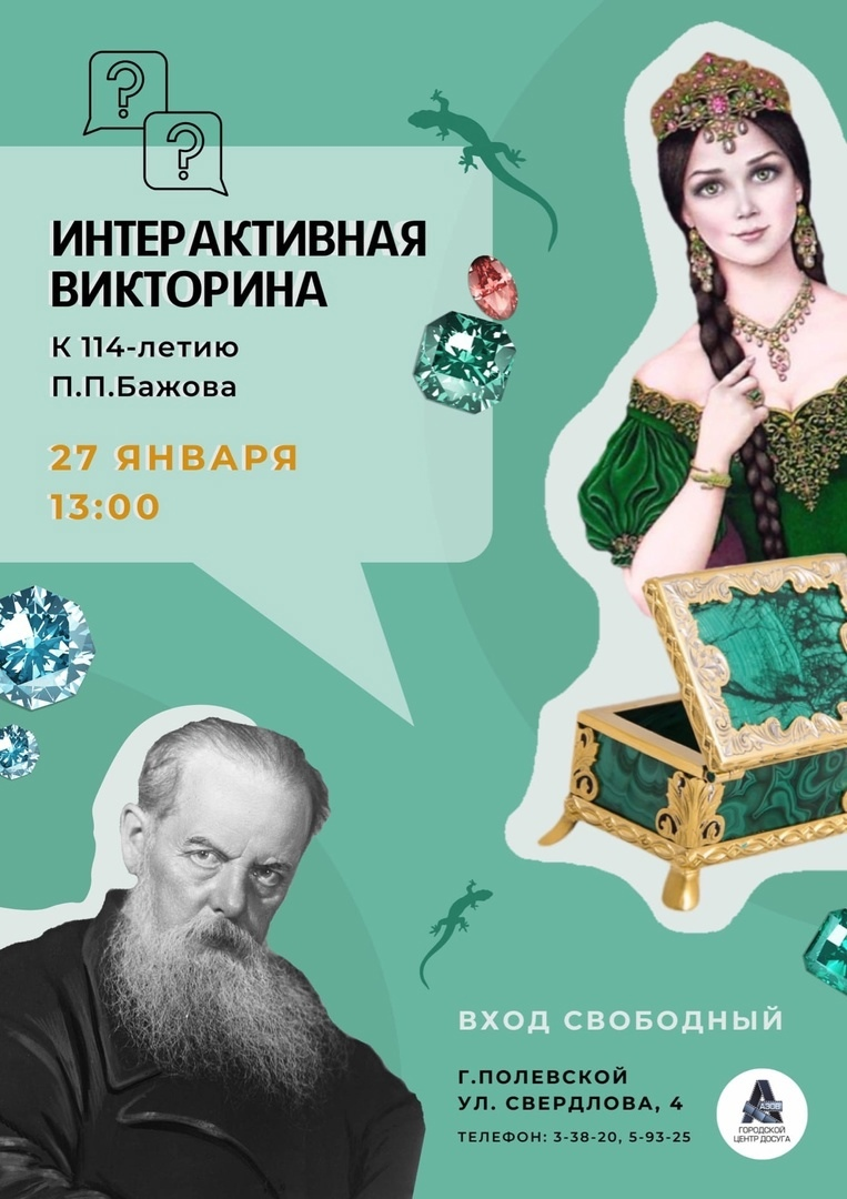 27 января в 13:00 в городском досуговом центре "Азов" состоится интерактивная викторина, посвященная 114-летию Павла Петровича Бажова. В этот день гости мероприятия вспомнят любимые сюжеты сказов уральского автора. Также полевчан встретит и вставка рисунков талантливых учащихся Детской художественной школы.