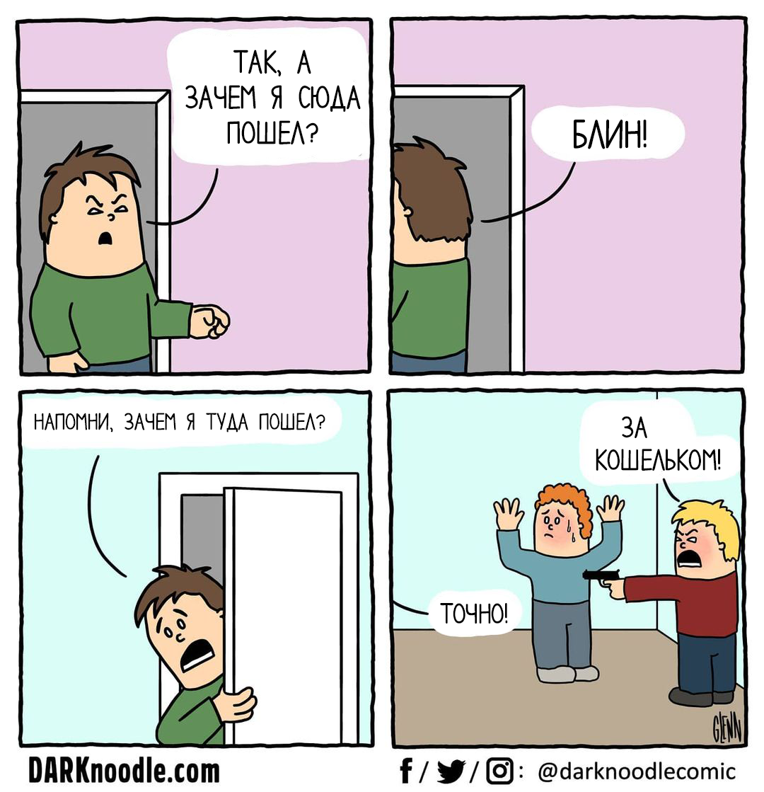 С помощью юмора любую, даже самую неприятную ситуацию, можно превратить во что-то, над чем захочется посмеяться. Чем, собственно и пользуются многие художники комиксов, придумывая свои сюжеты. К примеру, в теме ограбления с первого взгляда нет вообще ничего смешного. Но если речь идет не о реальной жизни, а о вымышленных ситуациях, в которых есть место юмору, абсурду и неожиданным и странным поворотам сюжета, то и посмеяться уже точно может быть над чем. В общем, сегодня я собрал для вас пачку комиксов про грабителей. Надеюсь, что они вас насмешат! Серия комиксов Dark Noodle («Темная Лапша») от американского художника под ником TJGlenn - это простенький визуальный стиль и абсурдный юмор. Сюжеты комиксов могут рассказывать о самых разных проблемах - от бытовых до фантастических. К примеру, одна из зарисовок посвящена знакомой многим ситуации, когда ты забыл зачем пришел в комнату. Американская художница Джулия Кэй (Julia Kaye) уже много лет рисует свою серию комиксов под названием Up an