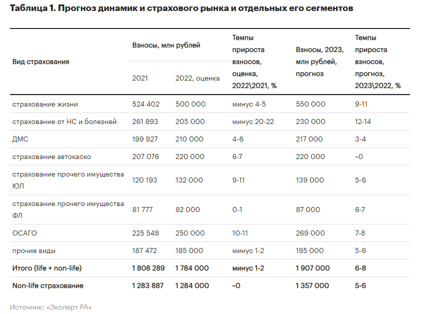 По прогнозу «Эксперт РА», динамика страхового рынка в 2023 году будет носить умеренный характер, темпы прироста премий составят порядка 7%. Совокупный объем страховых взносов перешагнет отметку 1,9 трлн рублей. Ключевыми факторами, которые будут определять динамику рынка, станут повышенные уровни инфляции и ключевой ставки, сниженная экономическая активность бизнеса и граждан, сохраняющийся дефицит отдельных видов товаров (прежде всего, в автомобильной отрасли), а также изменение поведенческих привычек потребителей. Существенные отклонения от прогноза возможны в случае возникновения новых внезапных экономических шоков.