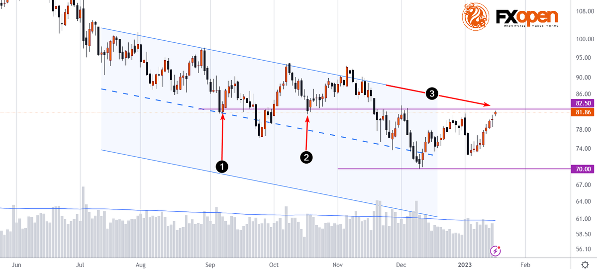 Однако действительно ли так и будет? Ведь важный драйвер инфляции – стоимость нефти, а сегодня цена фьючерса на Нью-Йоркской бирже достигла 82 долларов. Это самый высокий уровень за более чем 1 месяц. Спрос на нефть, возможно, растет на фоне снятия ограничений в экономике Китая. Цена находится около ключевого сопротивления $82.50, который в сентябре (1) и октябре (2) служил поддержкой. В текущей ситуации возрастает вероятность краткосрочного отката, так как быкам также нужно преодолевать линию тренда (3). Не исключено, что если произойдет бычий пробой, уровень опять будет оказывать поддержку. И это может спровоцировать очередной виток инфляции.