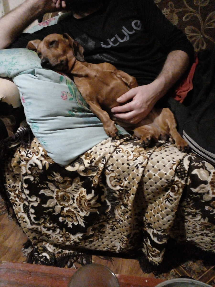 Ну, вот вам Серёга и Фаня. Не себя же с ним показывать, правда? А правда в том, что она его любит и он её. Лежат днём на диване и комп смотрят, а почему нет, если есть свободное время? Телевизор пока не сделали. Смотрим фильмы по компьютеру. Я за компом или готовлю что-нибудь. Хотя, мне везёт и он много сам готовит. Не выздоровеет никак до конца. Очень расстроен, что 19 января Крещение и не сможет искупаться в проруби. Решили-нет, категорически, после такой болезни. Валяются с Фанькой и ладно. Про постельное бельё много разговоров. Почему у меня его нет? Обычное дело для тех у кого собаки. Бельё и покрывала всё сдирают. Закапываются, накрываясь, возятся, спят. Смысла в белье нет. Кто-нибудь пробовал отучить собак от кровати? От того, чтобы с вами не спали? А этот диван проходной только для дня. Фаня выглядит несчастной? Это всё от того, что она не любимая? Не думаю. О Софийке новостей пока нет, но плачу каждый день. Многие не поверят, но местные обещали, что весной найдут, ког