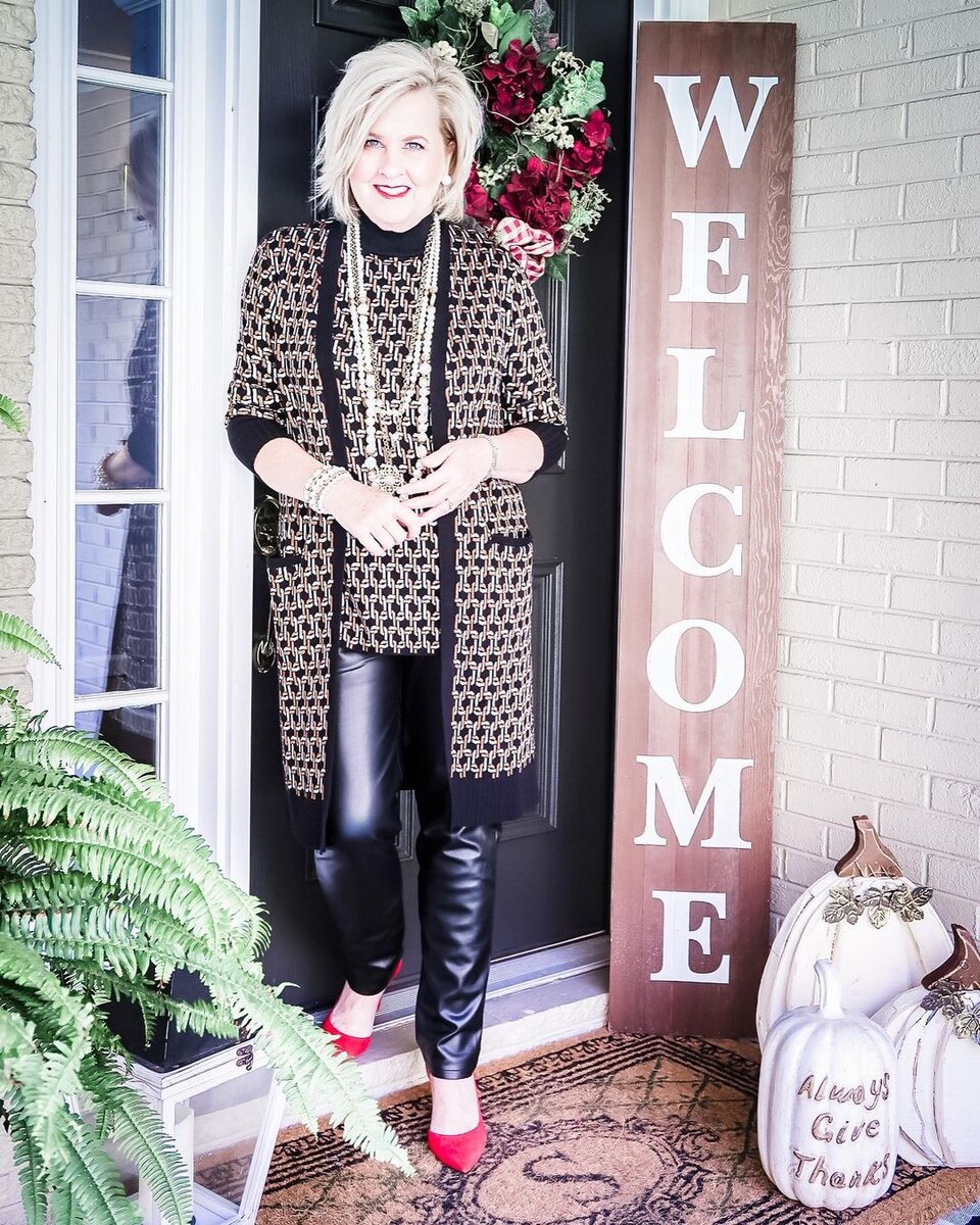 - Комплект из брюк из экокожи и трикотажной «двойки». Брюки прямого силуэта, не широкие, но и не облегающие. Верхняя часть ансамбля представлена комплектом из джемпера с короткими рукавами и удлиненного кардигана с рукавами длиной три четверти. Комплект из плотного трикотажа с геометрическим узором светло-песочного оттенка на черном фоне. Обе вещи прямого силуэта, кардиган длиной до колена. Яркая деталь образа – туфли, это лодочки красного цвета.