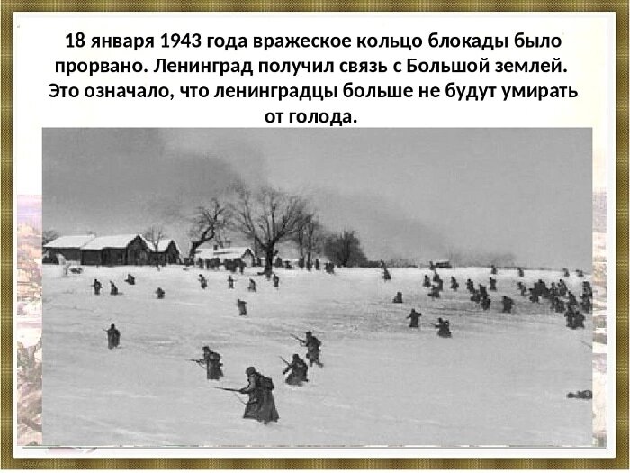 18 января 1943 года были освобождены город Шлиссельбург и южное побережье Ладожского озера. Операция "Искра" стала коренным переломом в битве за Ленинград.