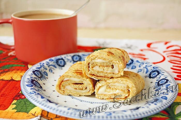 - Снять со сковороды. На горячий овсяноблин выложить сыр моцареллу и скрутить рулетом.