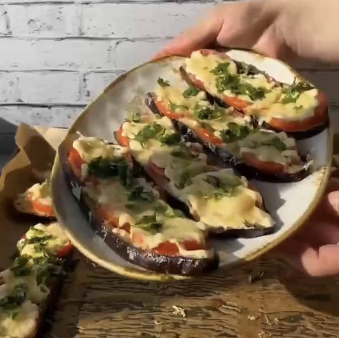 🍆 Баклажаны по-французски Ингредиенты: Баклажаны - 2 - 3 шт. Сыр - 200 гр. Майонез - 2 ст.л. Помидоры - 3 - 4 шт. Растительное масло 🔥Приготовление: 1. Баклажаны нарезать пластинками, разложить на противень застеленный пергаментной бумагой. 2. Растительное масло и специи соединить, перемешать и смазать этим соусом баклажаны. 3. Сверху баклажан выложить помидоры ,сделать сетку из майонеза и сверху посыпать тёртым сыром. 4. Выпекать при 180С 15 минут. Приятного аппетита! #выпечка